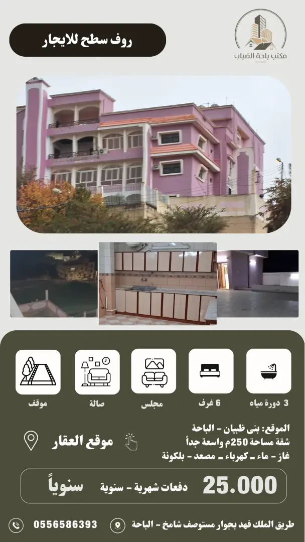 شقة روف سطح للايجار الشقةبها مدخلين منفصلين أحدهما للرجال والآخر للنساء مكونة من : مجلس كبير مساحة ٣٥ م٢. مقلط كبير مساحة ٣٥م٢ صالة كبيرة تشرف على مناظر جميلة . غرفة نوم رئسية بحمام واسع . غرفة نوم خادمة أو أطفال. غرفة جلوس نساء كبيرة
